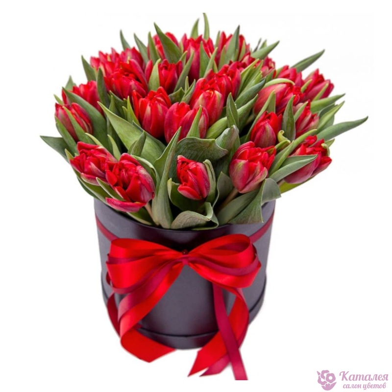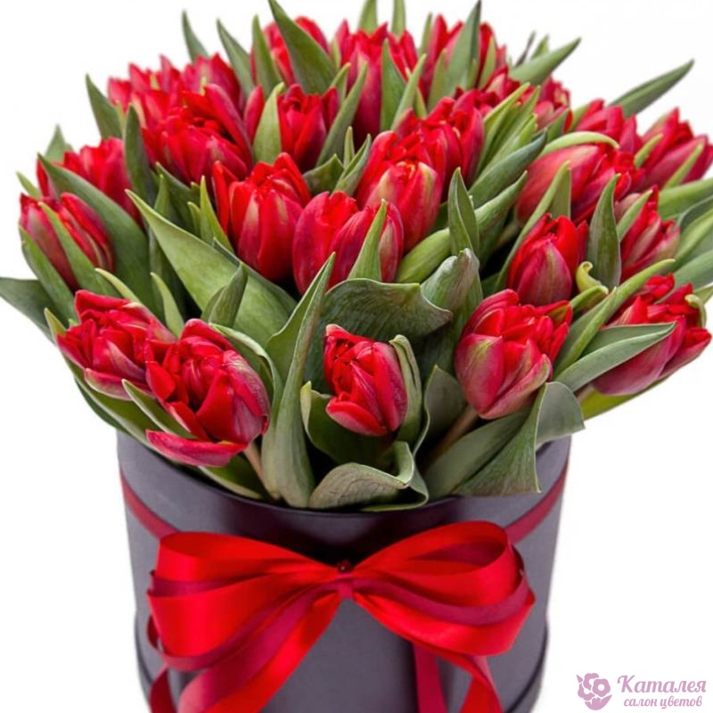 Букет состоит из 29 красных тюльпанов, коробка, атласная лента, оазис.