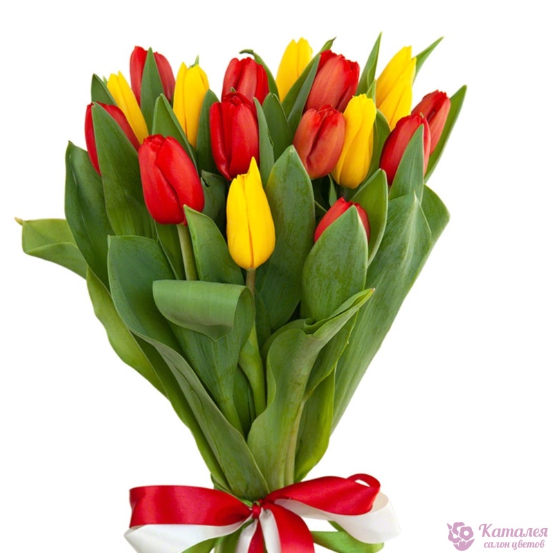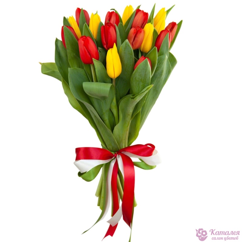 Букет состоит из 10 красных тюльпанов, 7 желтых тюльпанов, прозрачная упаковка, атласная лента.
