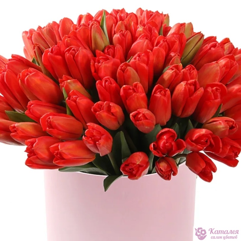 Букет состоит из 75 красных тюльпанов, коробка, оазис.