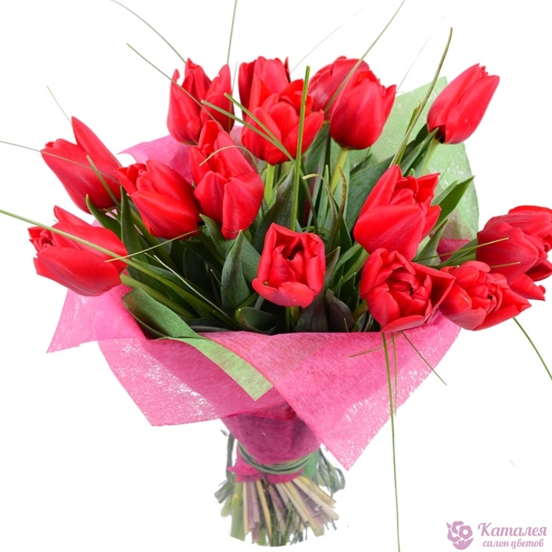 Букет состоит из 15 красных тюльпанов, зелень, красивая упаковка, атласная лента.