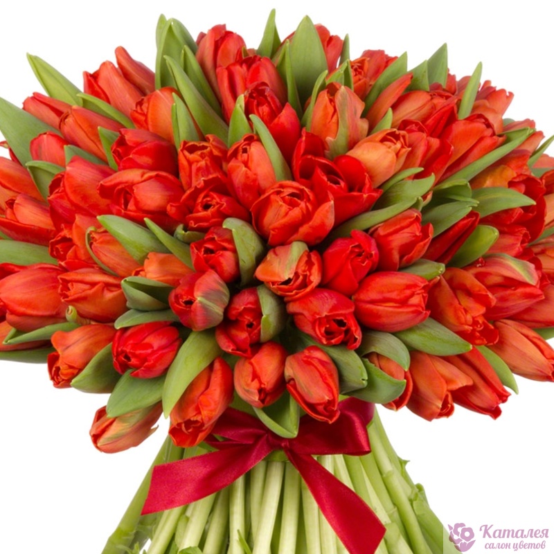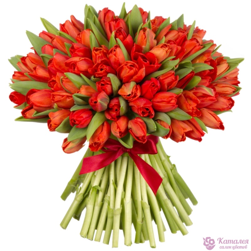 Букет состоит из 75 красных тюльпанов, прозрачная упаковка, атласная лента.