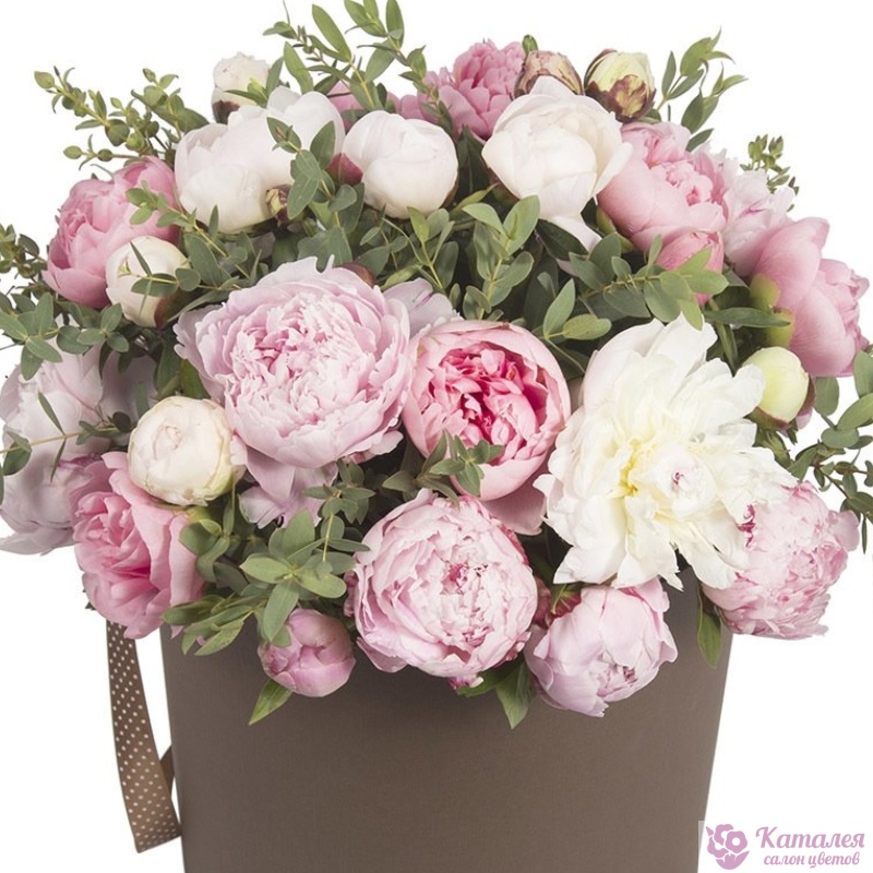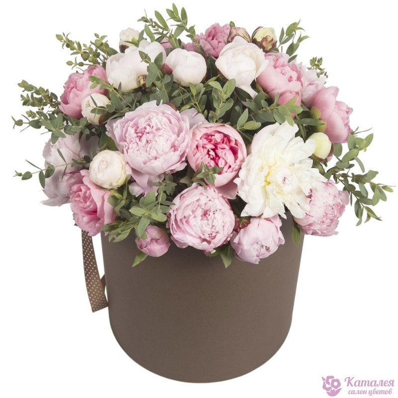 Буке из белых и розовых пионов в коробке