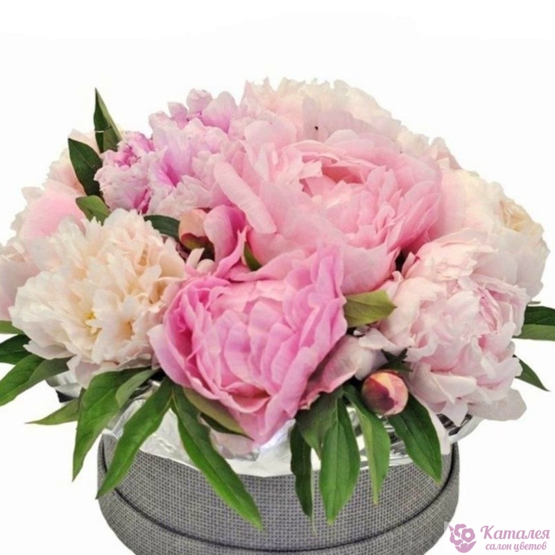 Букет состоит из 11 разноцветных пионов, зелень, коробка, оазис.