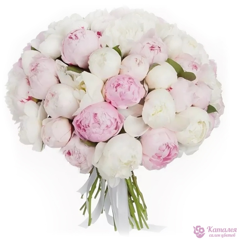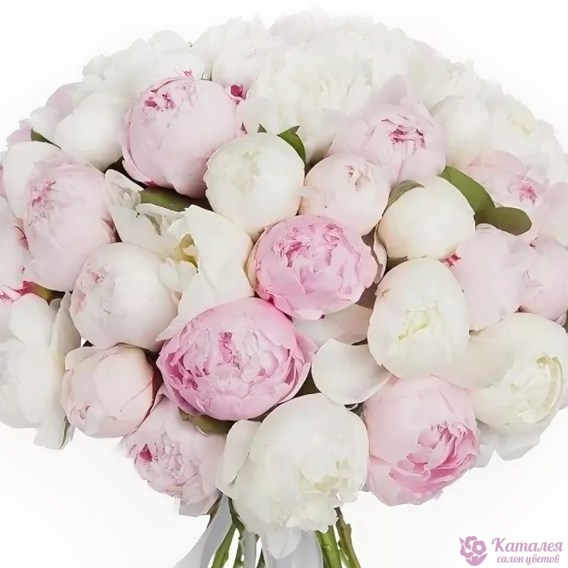 Букет состоит из MIX из 51 белого и розового пиона, прозрачная упаковка, атласная лента.