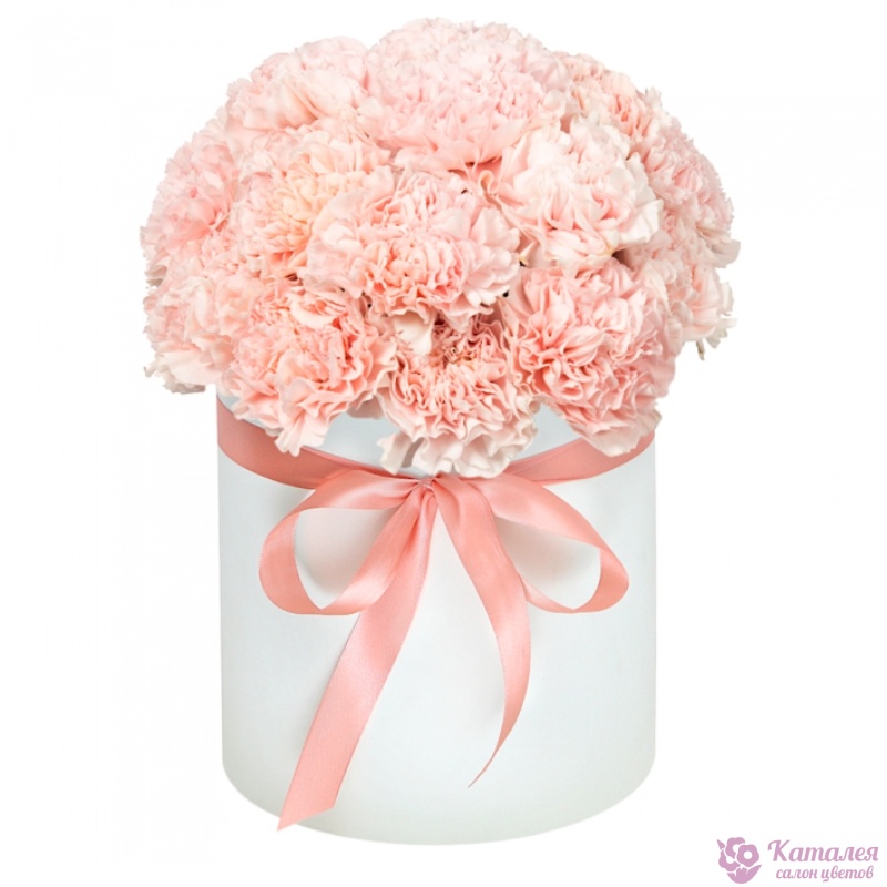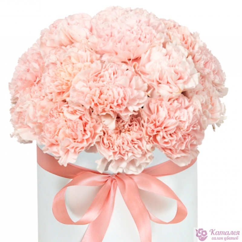 Букет состоит из 27 розовых гвоздик, коробка, атласная лента, оазис.