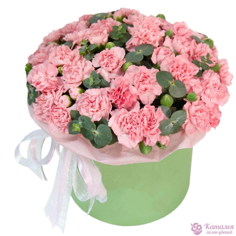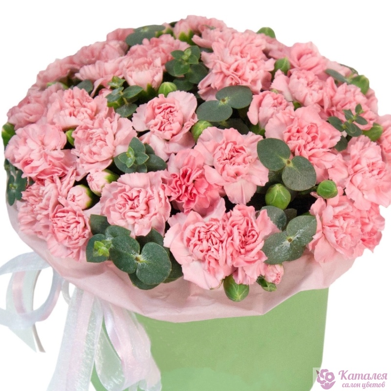 Букет состоит из 15 веток кустовых гвоздик, эвкалипт, коробка, оазис.