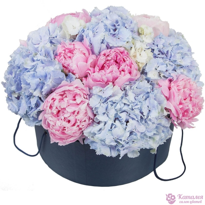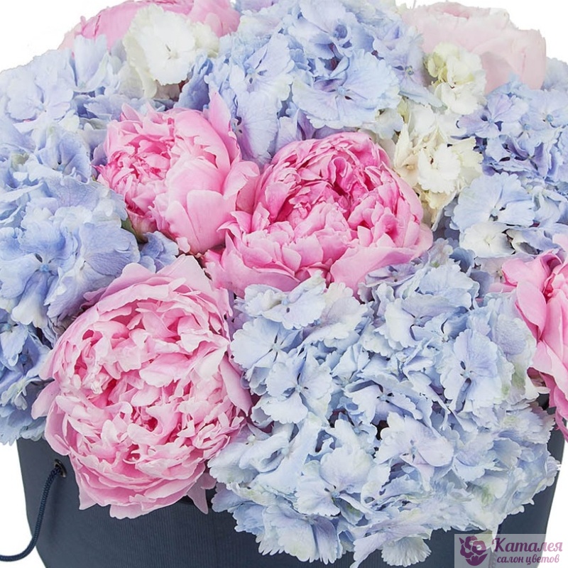 Букет состоит из 7 пионов, 6 гортензий, коробка, оазис.