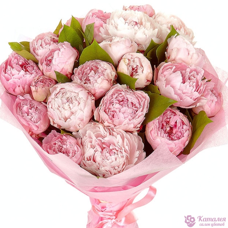 Букет состоит из 21 розовый пион, зелень, красивая упаковка, атласная лента.