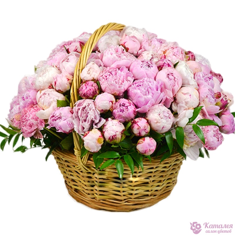 75 розовых пионов, зелень, корзина, оазис.