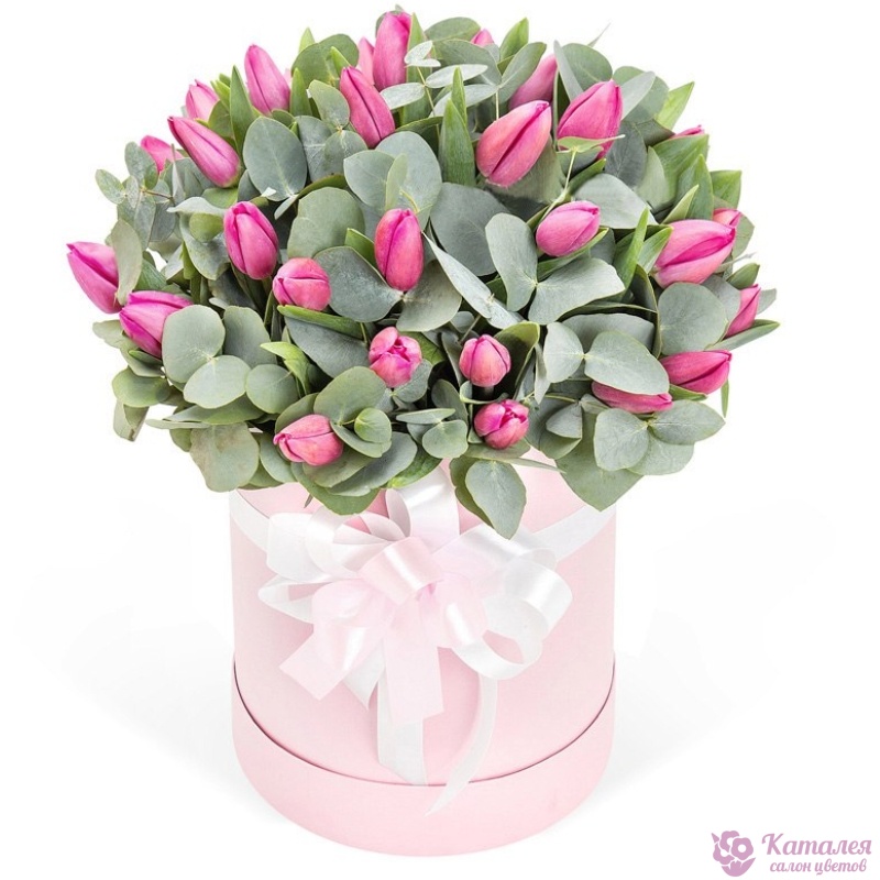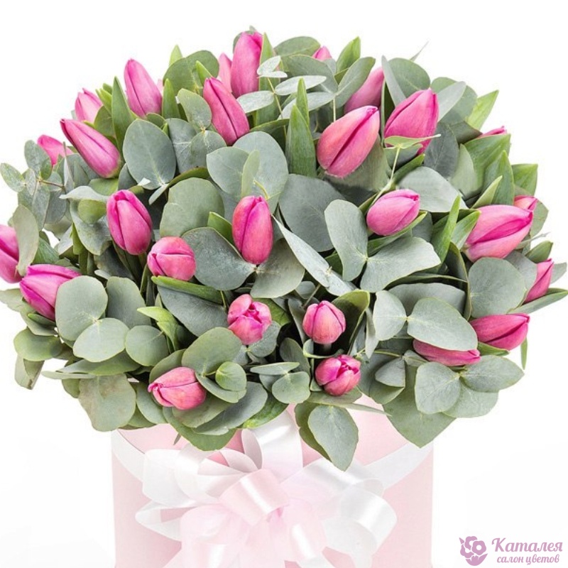 Букет состоит из 45 тюльпанов, эвкалипт, коробка, атласная лента, оазис.