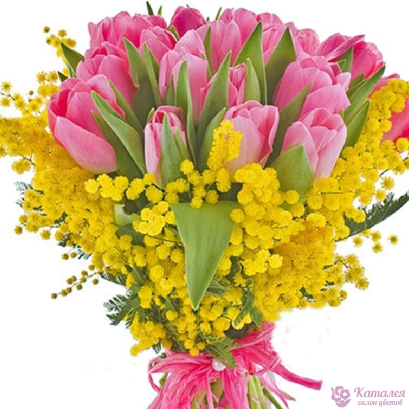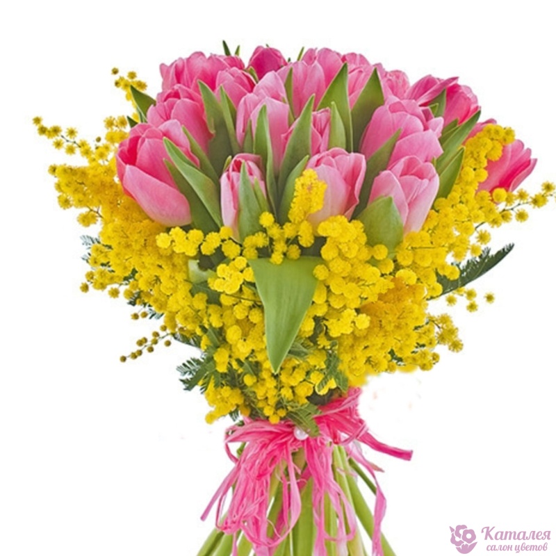 Букет состоит из 21 розовый тюльпан, 7 веток мимозы, прозрачная упаковка, атласная лента.