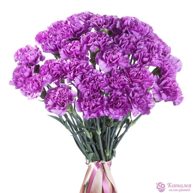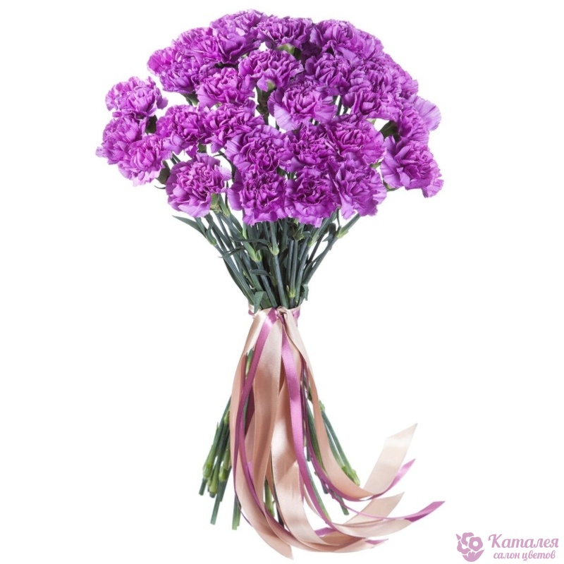 Букет состоит из 27 сиреневых гвоздик, прозрачная упаковка, атласная лента.