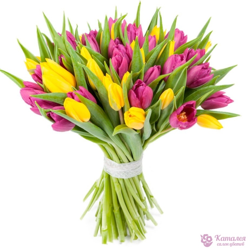 Букет состоит из 26 сиреневых тюльпанов, 25 желтых тюльпанов, прозрачная упаковка, атласная лента.