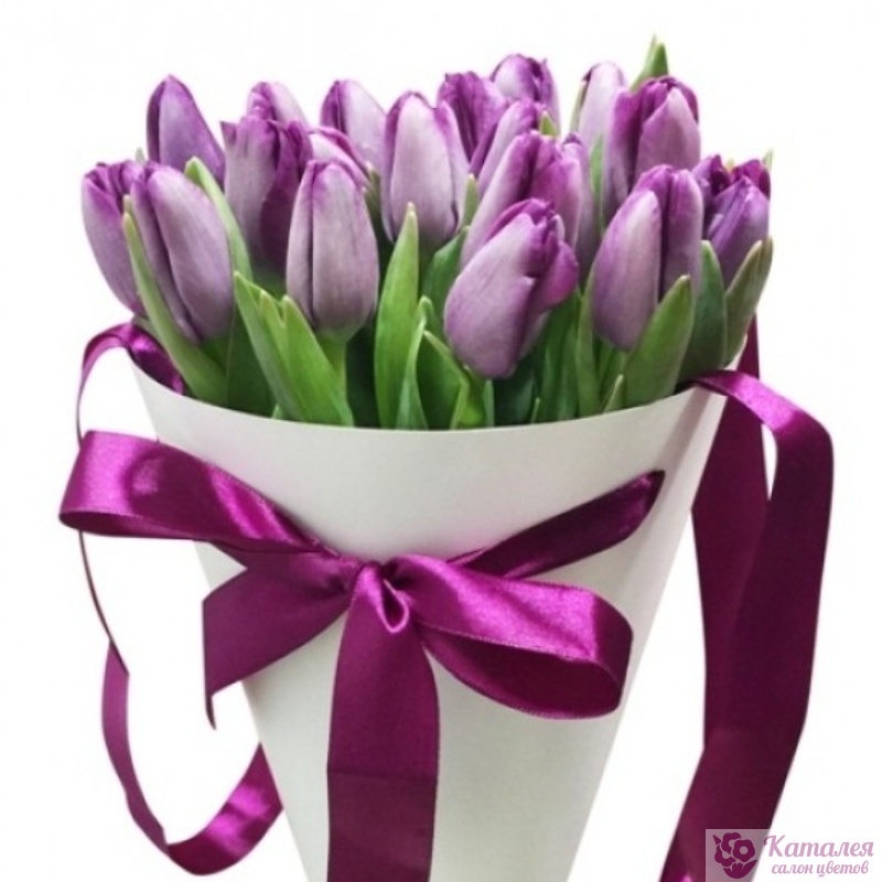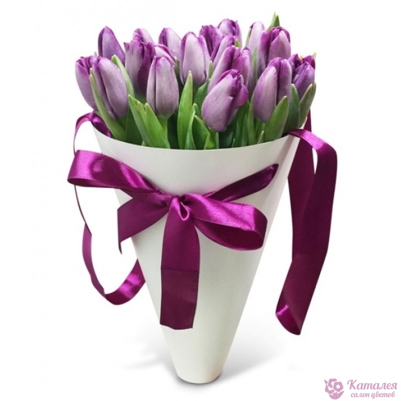 Букет состоит из 19 сиреневых тюльпанов, конус, атласная лента.