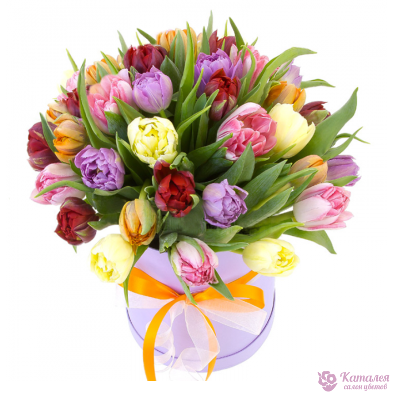 Букет состоит из MIX из 39 тюльпанов, коробка, атласная лента, оазис.
