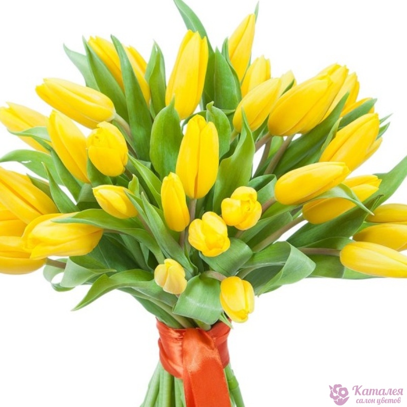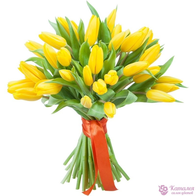 Букет состоит из 31 желтый тюльпан, прозрачная упаковка, атласная лента.