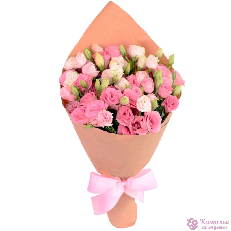 Букет состоит из 15 веток розовой эустомы, крафт, атласная лента.