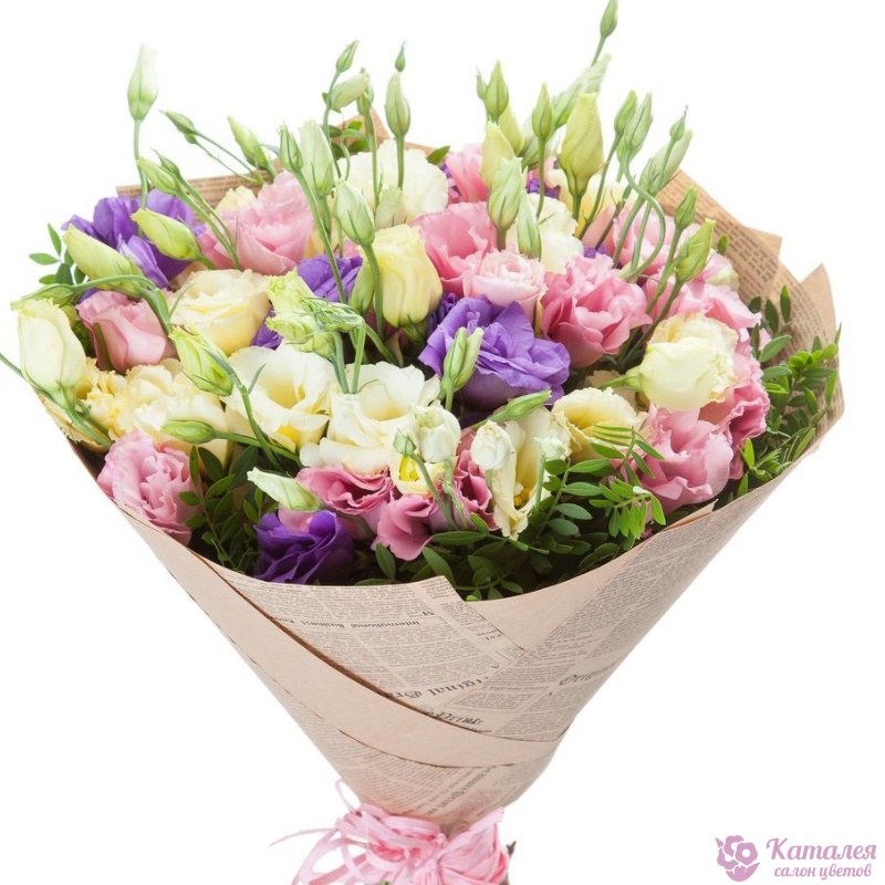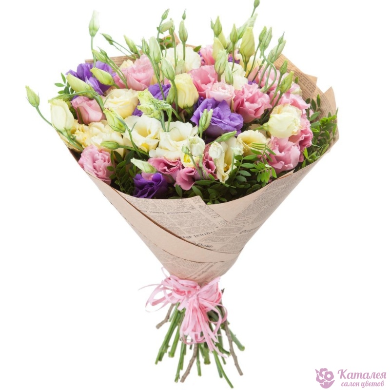 Букет состоит из MIX из 17 веток эустомы, зелень, крафт, атласная лента.