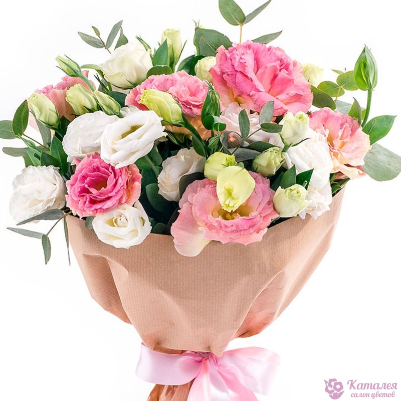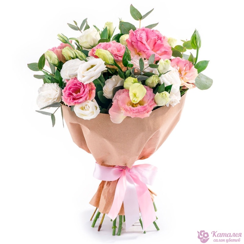Букет состоит из 15 веток белой и розовой эустомы, зелень, крафт, атласная лента.