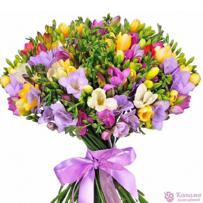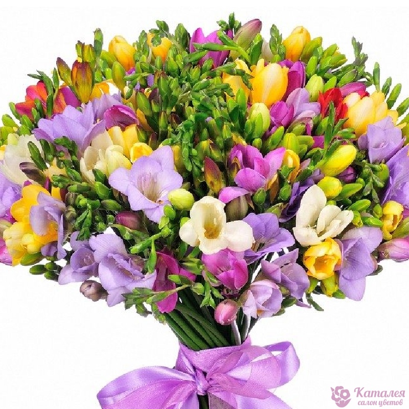 Букет состоит из Букет MIX из 51 фрезии, прозрачная упаковка, атласная лента.