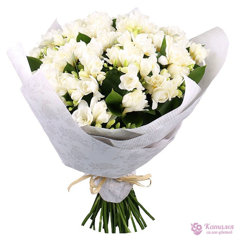 Букет состоит из 35 белых фрезий, зелень, крафт, атласная лента.