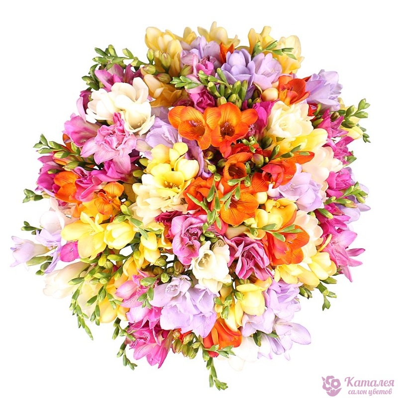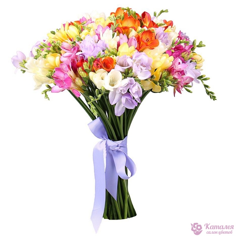 Букет состоит из MIX из 45 фрезий, прозрачная упаковка, атласная лента.