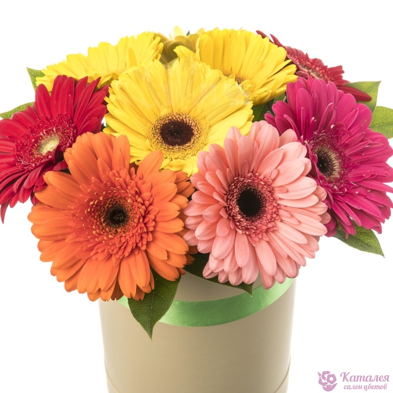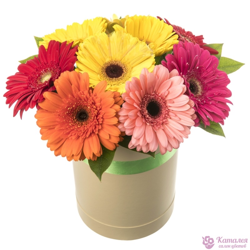 Букет состоит из MIX из 9 гербер, салал, коробка, атласная лента.