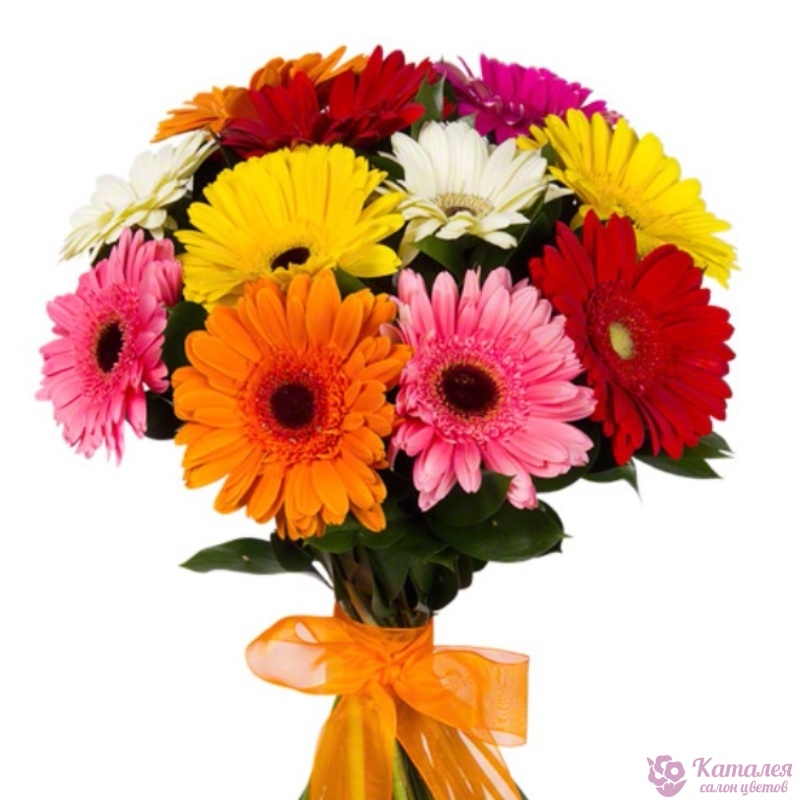 Букет состоит из MIX из 15 оранжевых / розовых / желтых / красных / белых гербер, прозрачная упаковка, атласная лента.