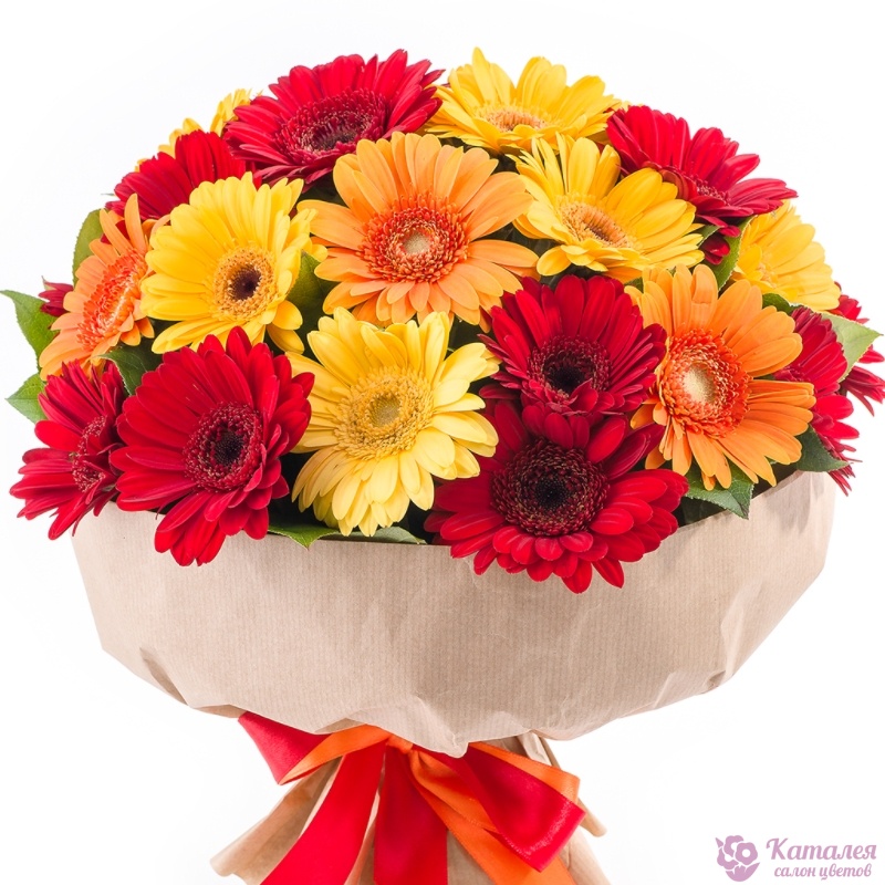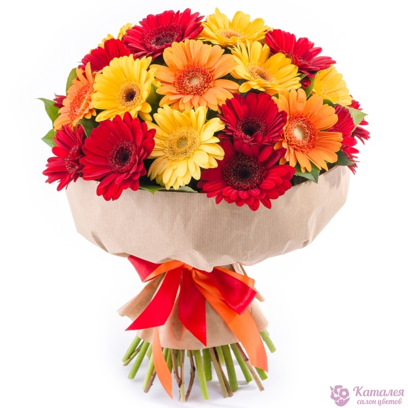 Букет состоит из MIX из 29 гербер, салал, крафт, атласная лента.