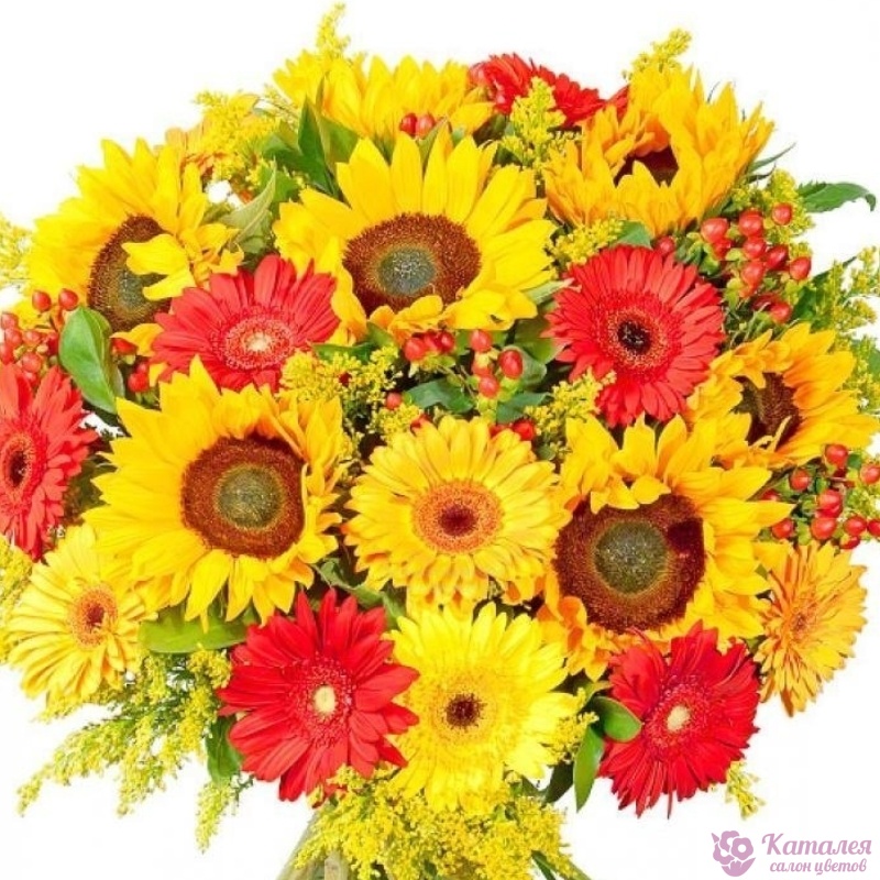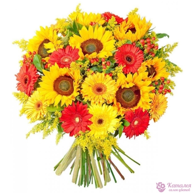 Гербера 11 шт., Гиперикум 7 шт., Подсолнух 7 шт. |