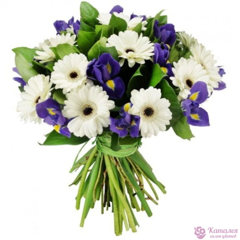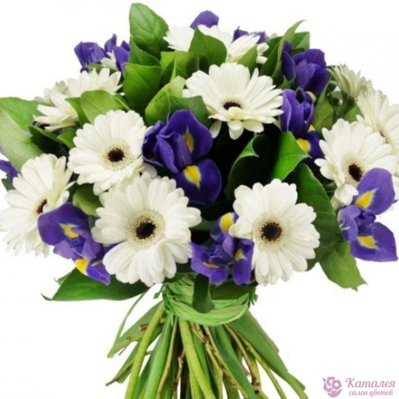 Букет состоит из 15 гербер, 16 ирисов, салал, прозрачная упаковка, атласная лента.