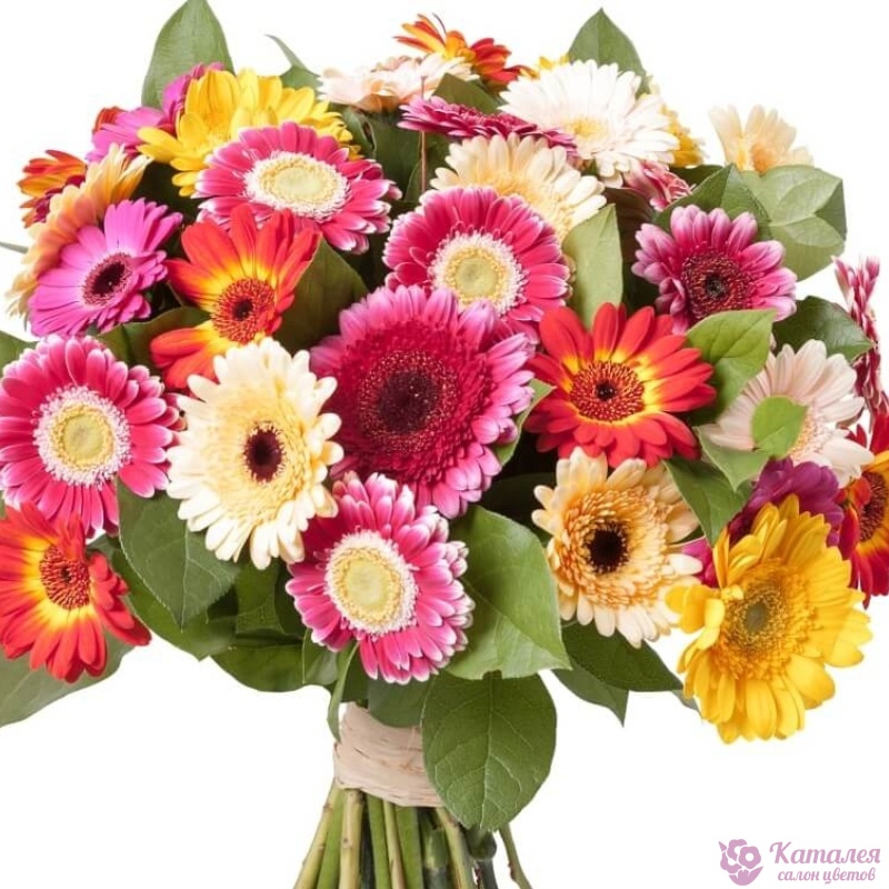 Букет состоит из MIX из 29 гербер, зелень, прозрачная упаковка, атласная лента.