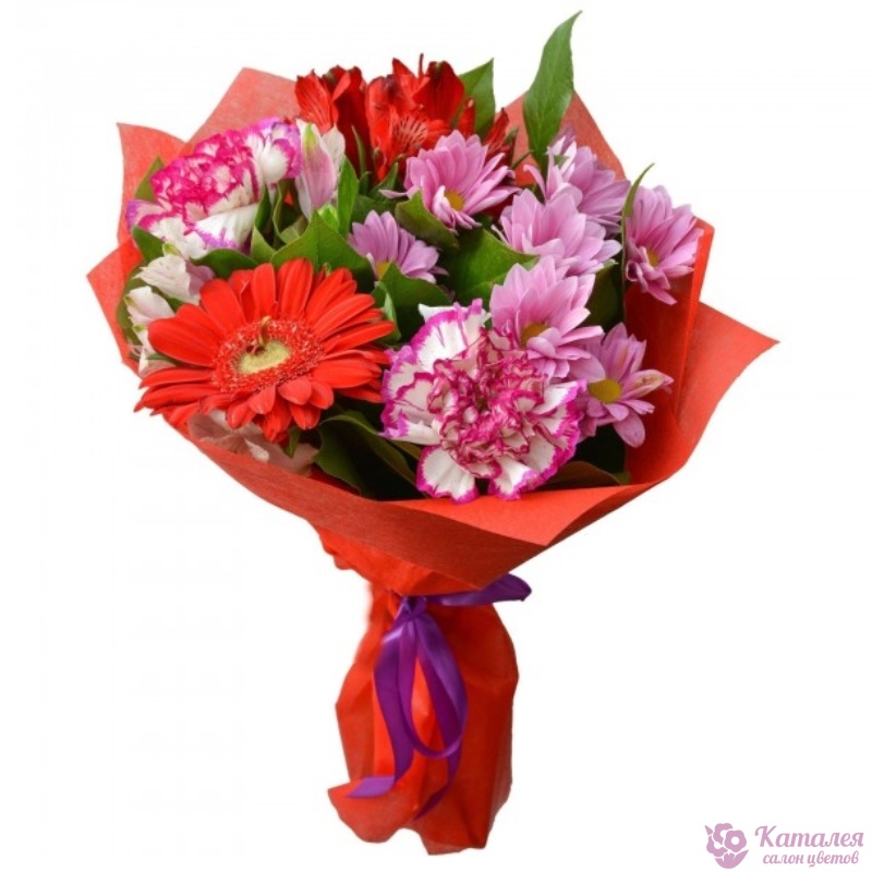 Букет состоит из 1 гербера, 2 гвоздики, 2 альстромерии, 2 хризантемы, зелень, красивая упаковка, атласная лента.