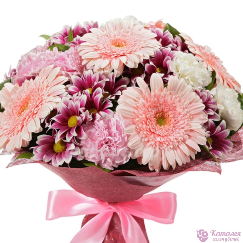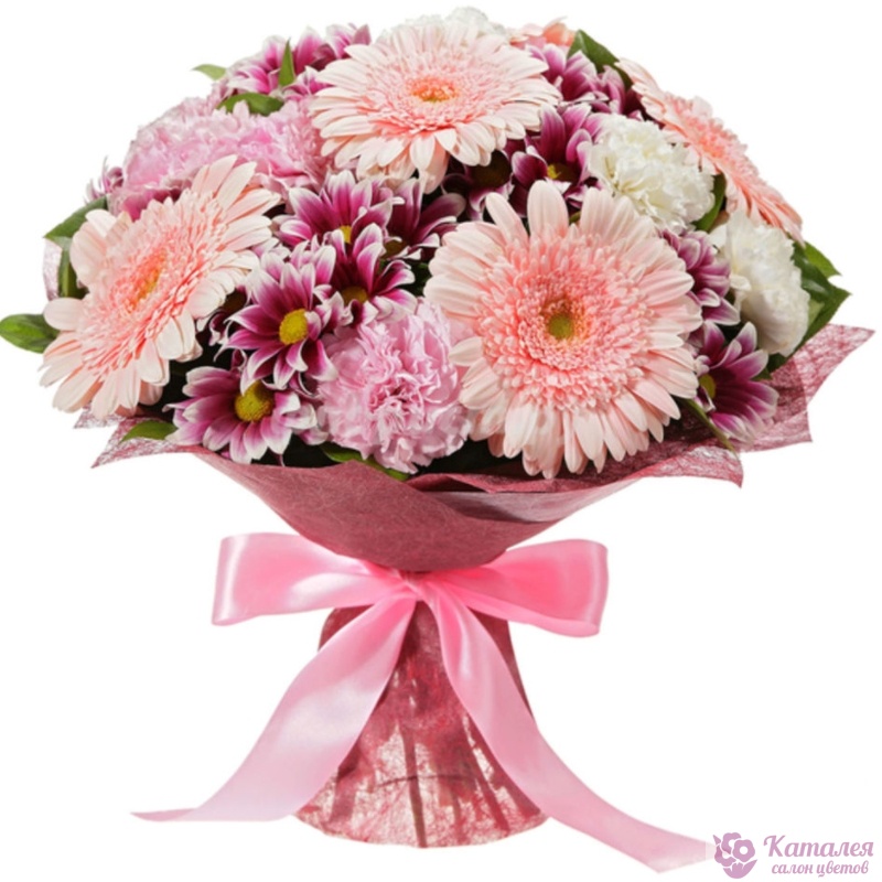 Букет состоит из 6 гербер, 5 веток хризантем, 10 белых и розовых гвоздик, салал, красивая упаковка, атласная лента.
