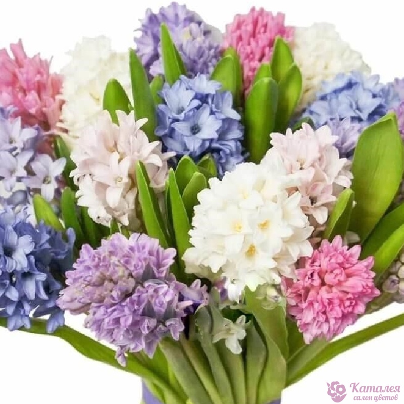 Букет состоит из MIX из 19 гиацинтов, прозрачная упаковка, атласная лента.