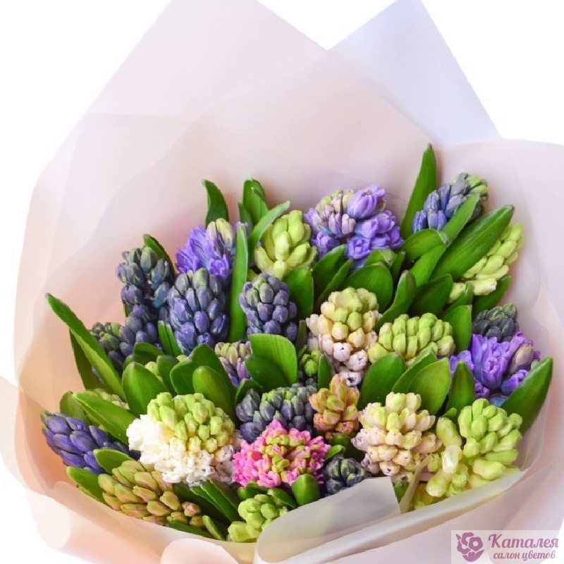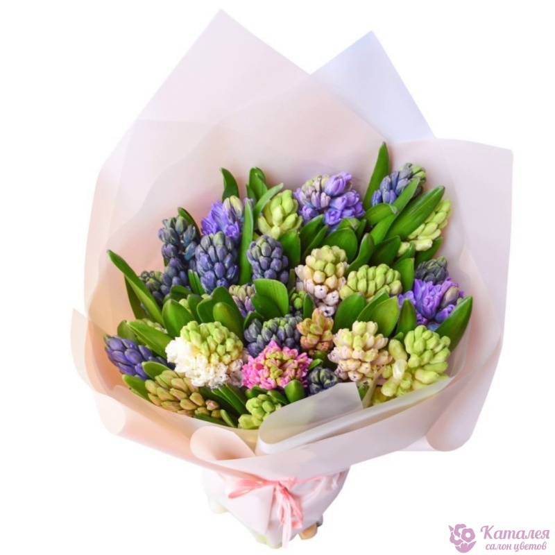 Букет состоит из 25 гиацинтов, красивая упаковка, атласная лента.