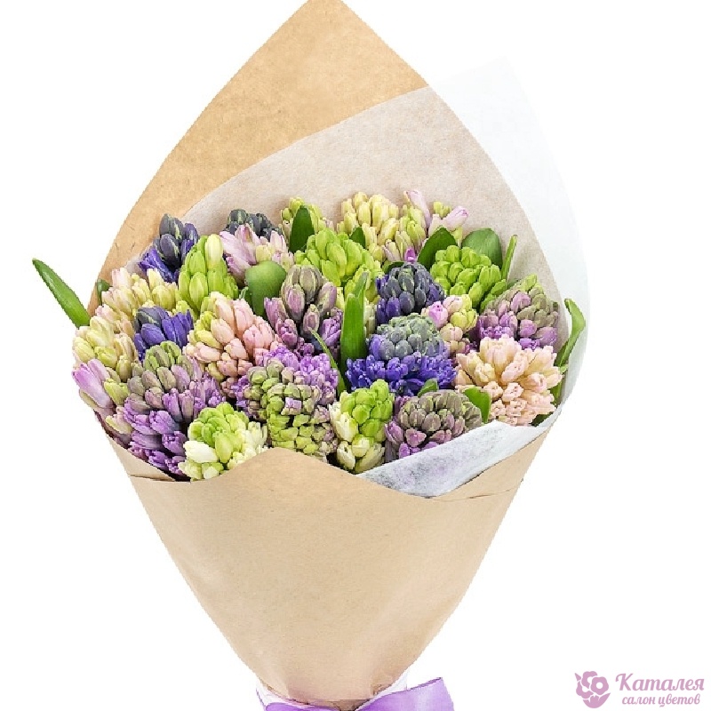 Букет состоит из 21 гиацинт, крафт, атласная лента.