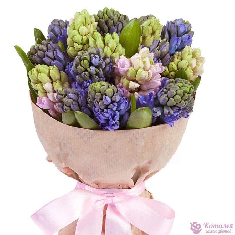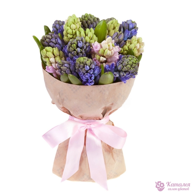 Букет состоит из MIX из 15 гиацинтов, крафт, атласная лента.