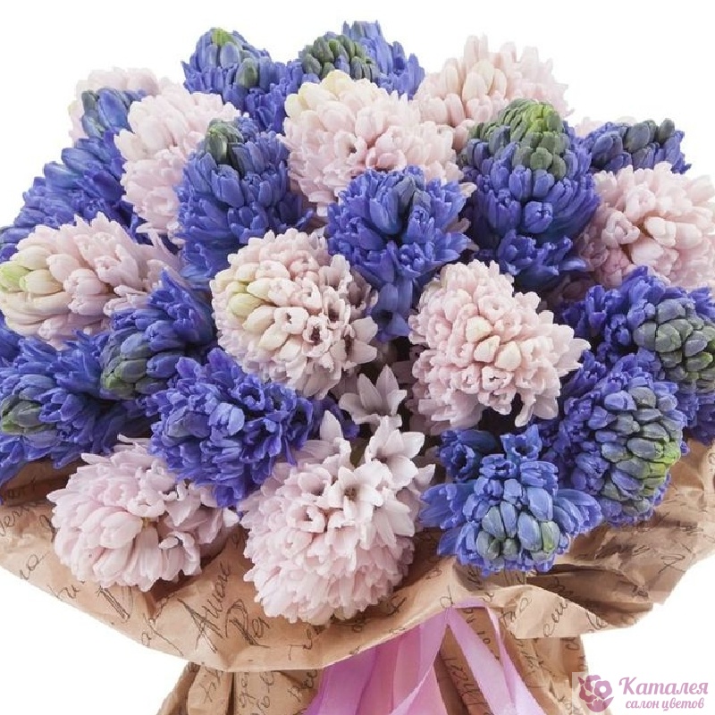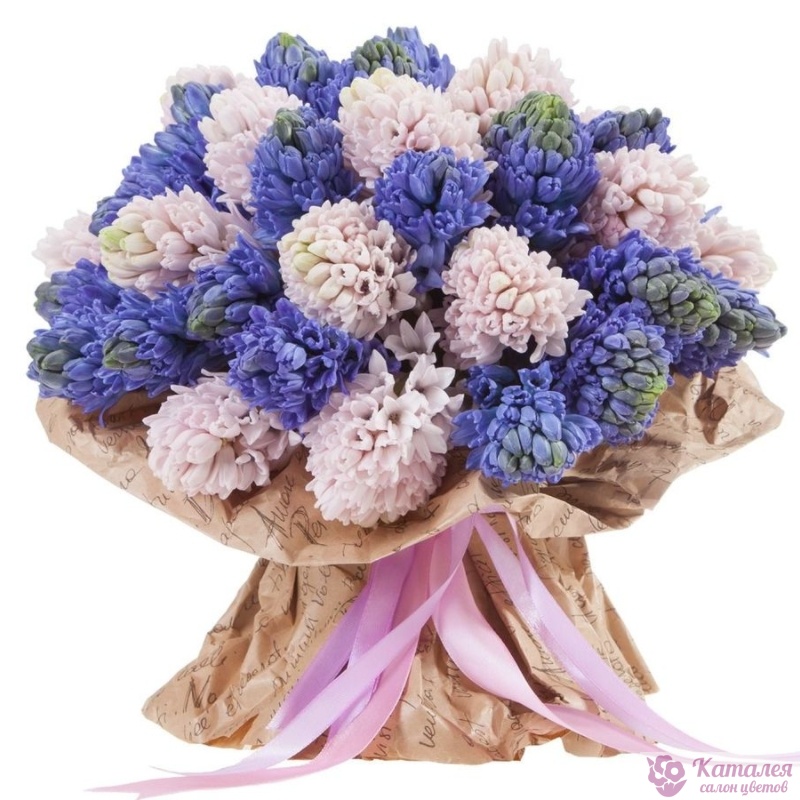 Букет состоит из MIX из 35 гиацинтов, крафт, атласная лента.