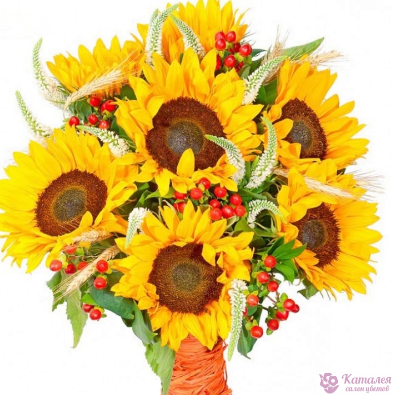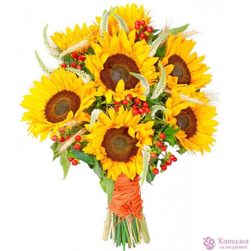 Букет состоит из 9 подсолнухов, 10 веток гиперикума, 12 вероника белая, колосья, зелень, прозрачная упаковка, атласная лента.