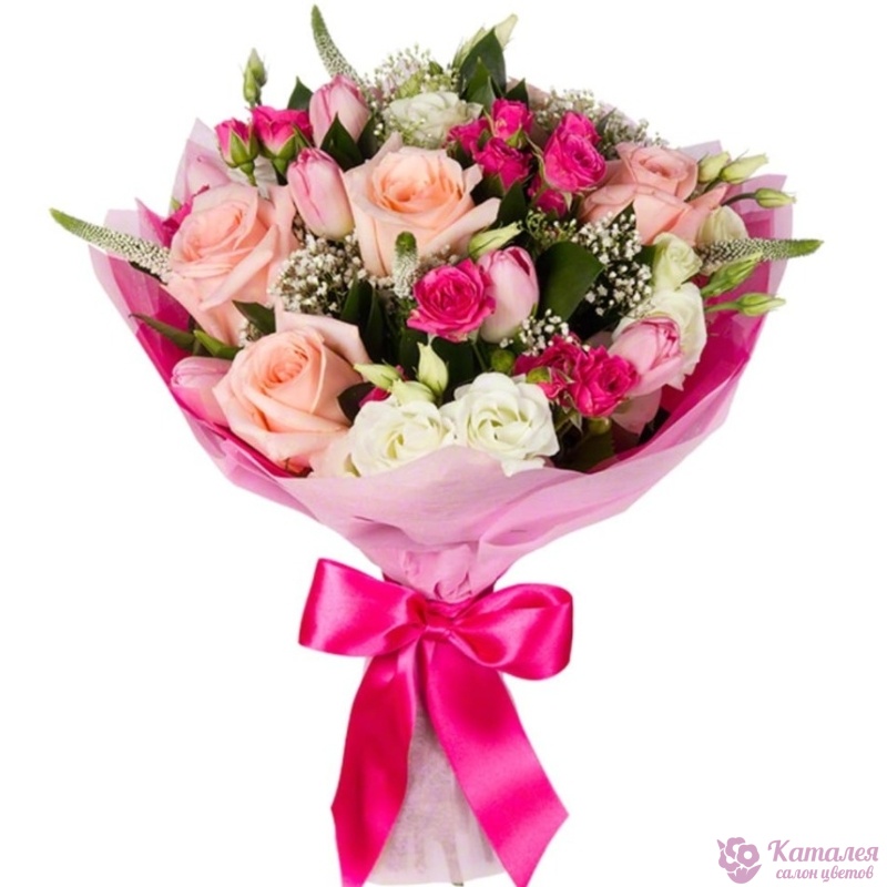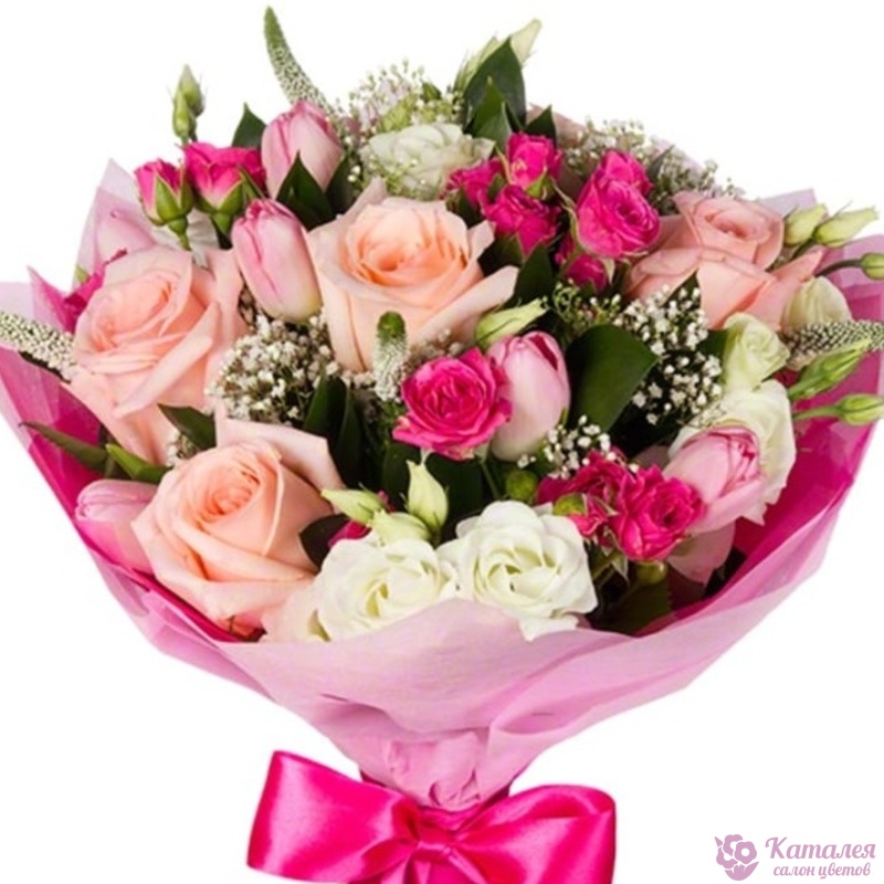 Букет состоит из 5 розовых роз, 4 малиновые кустовые розы, 3 эустомы, 7 розовых тюльпанов, 4 гипсофила, декоративная зелень, красивая упаковка, атласная лента.