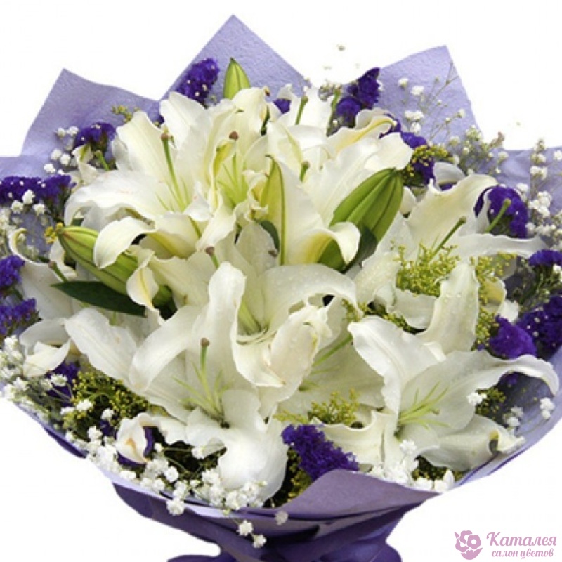 Букет состоит из 13 красных роз, 7 веток белых лилий, красивая упаковка, атласная лента.