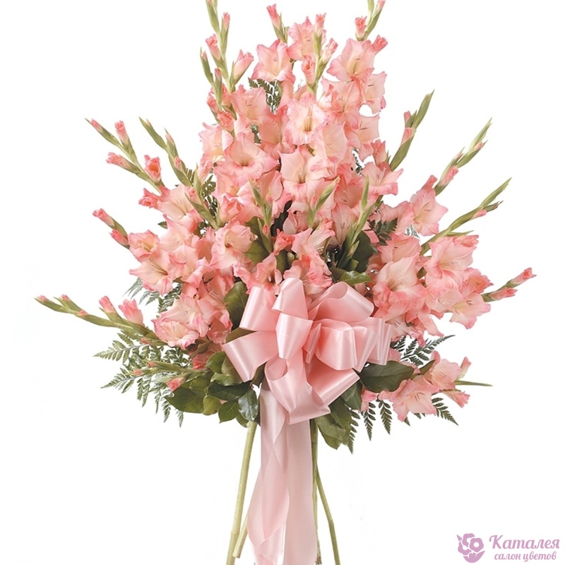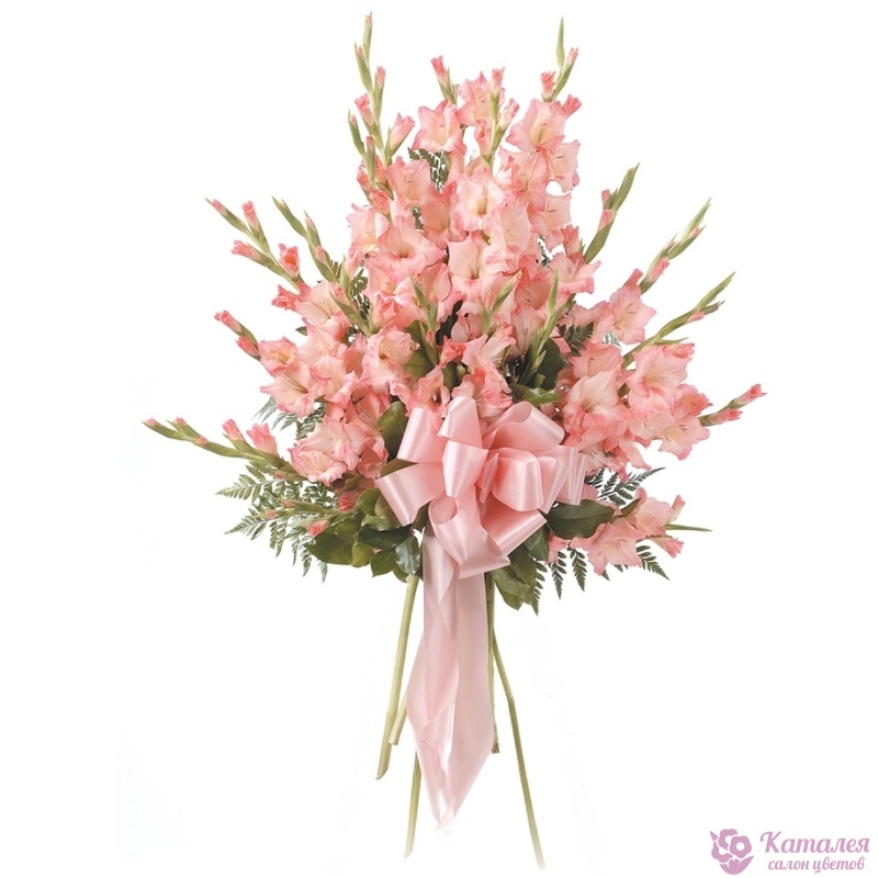 Букет состоит из 19 розовых гладиолусов, зелень, прозрачная упаковка, атласная лента.