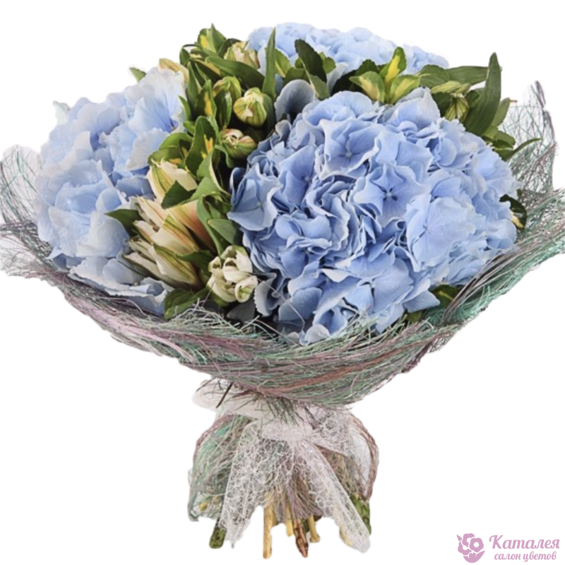 Букет состоит из 3 гортензии, 5 веток альстромерии, красивая упаковка, атласная лента.