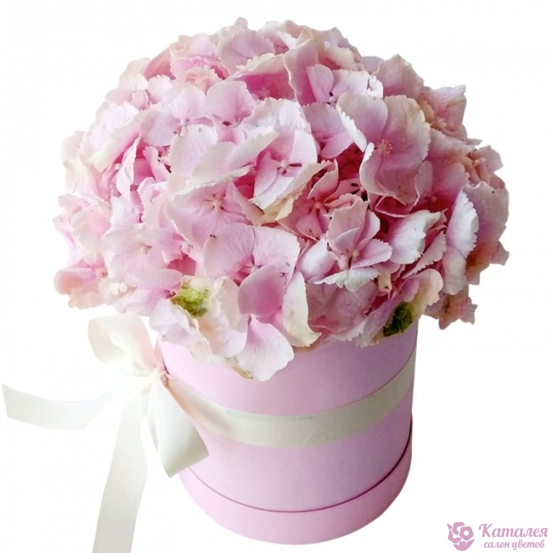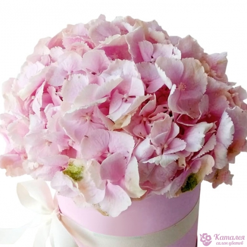 Букет состоит из 3 розовые гортензии, коробка, атласная лента, оазис.