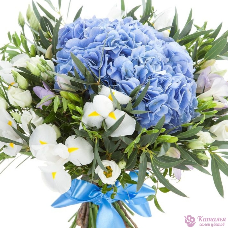 Букет состоит из 1 синяя гортензия, 11 белых ирисов, 9 веток эустомы, зелень, прозрачная упаковка, атласная лента.