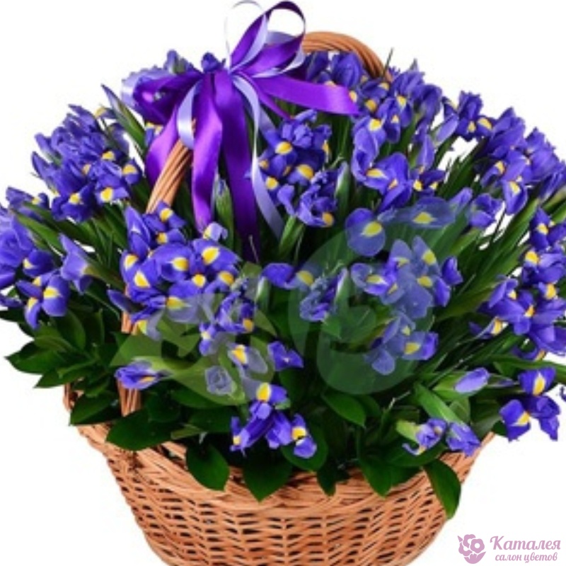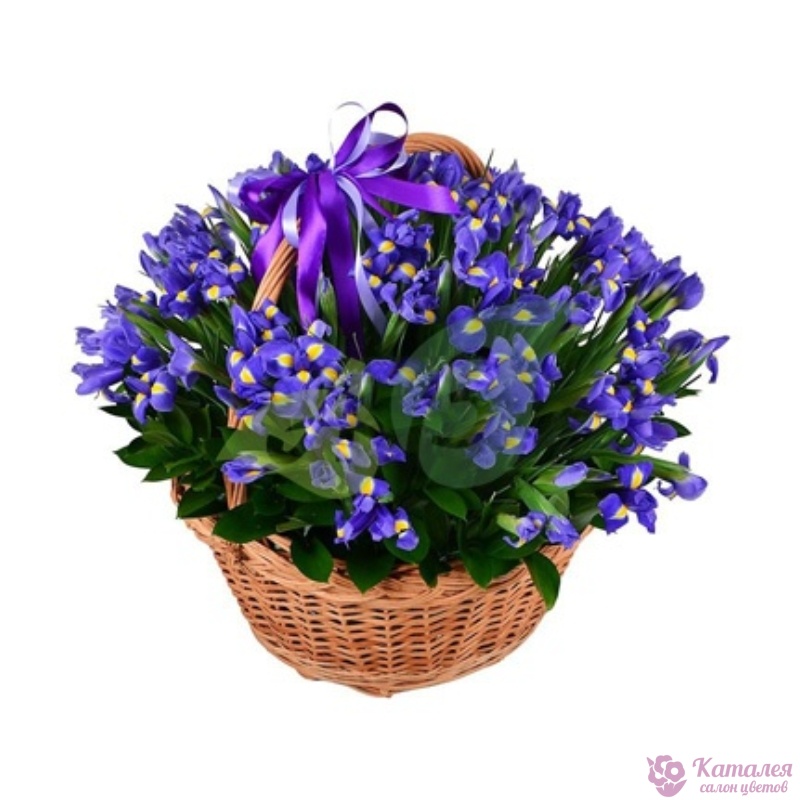 Букет состоит из 51 ирис, зелень, корзина, атласная лента.
