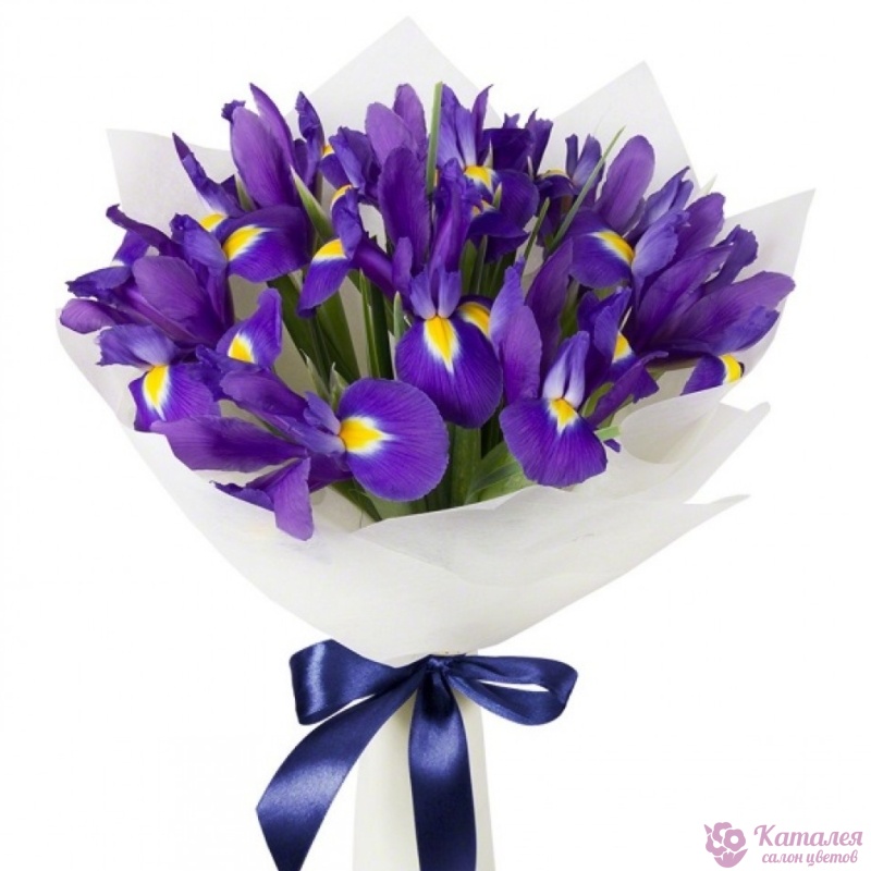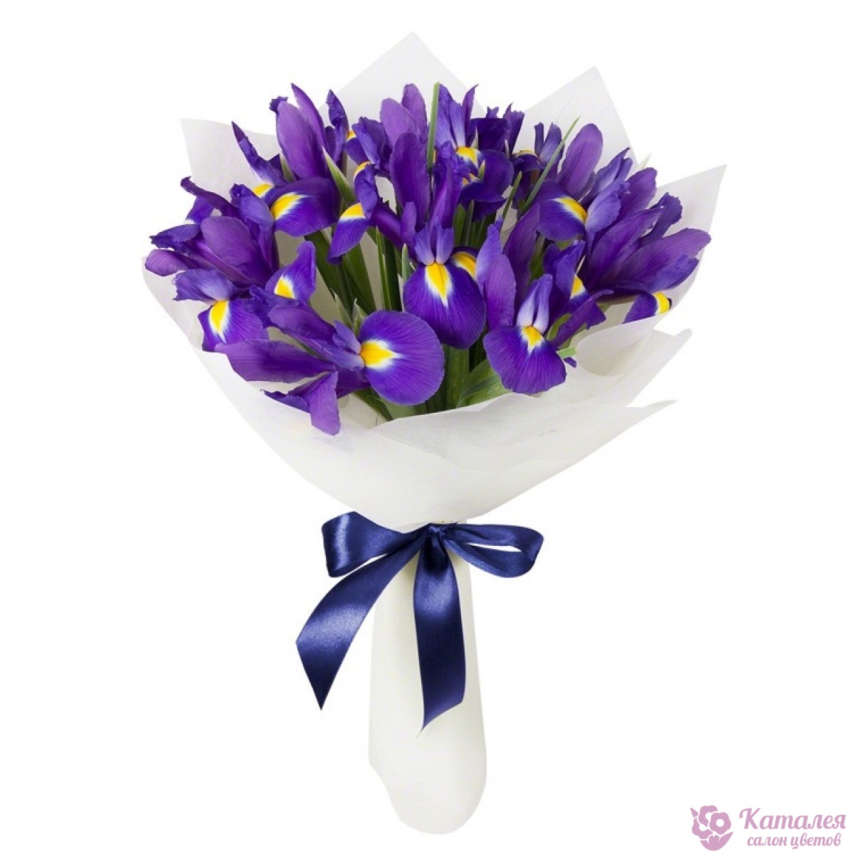 Букет состоит из 21 ирис, белая упаковка, синяя лента.
