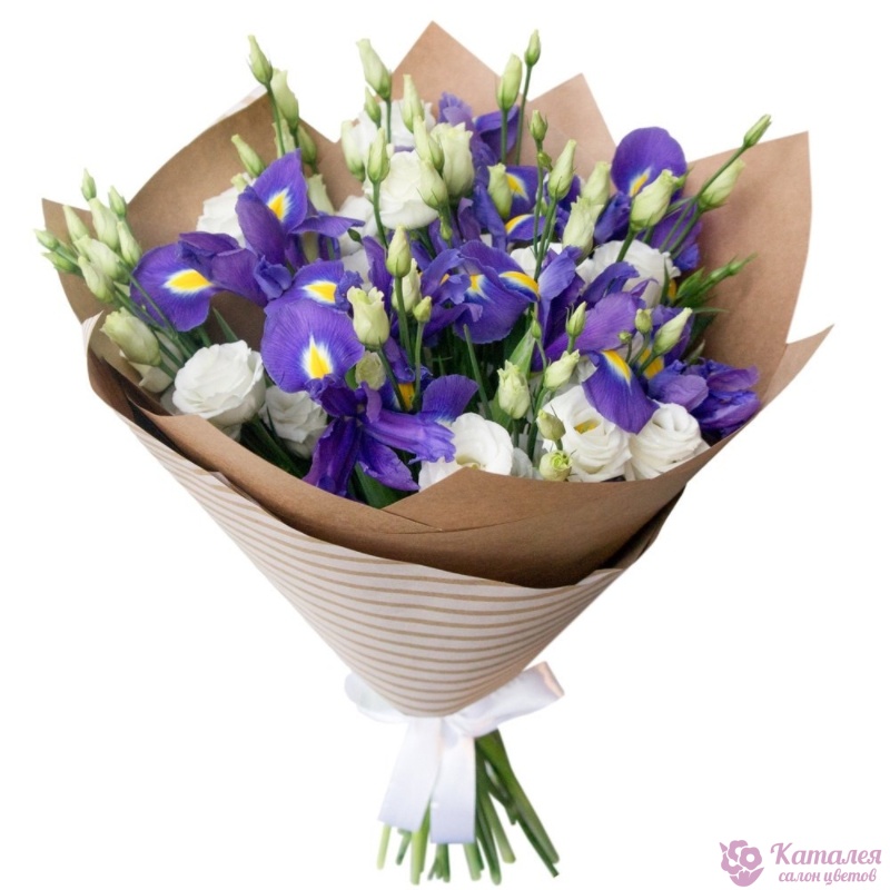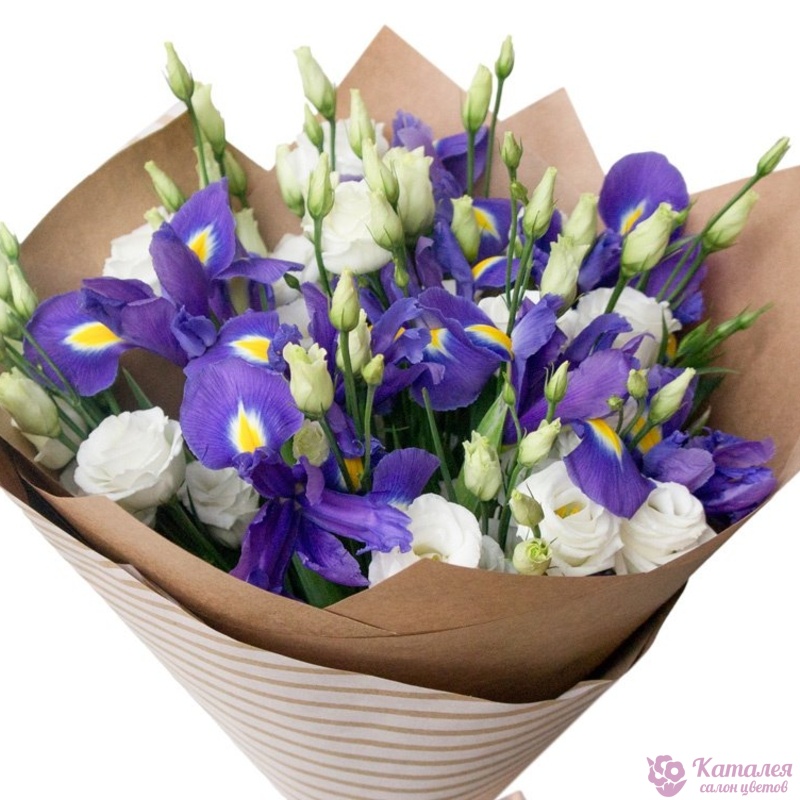 Букет состоит из 5 веток эустомы, 9 ирисов, крафт, атласная лента.