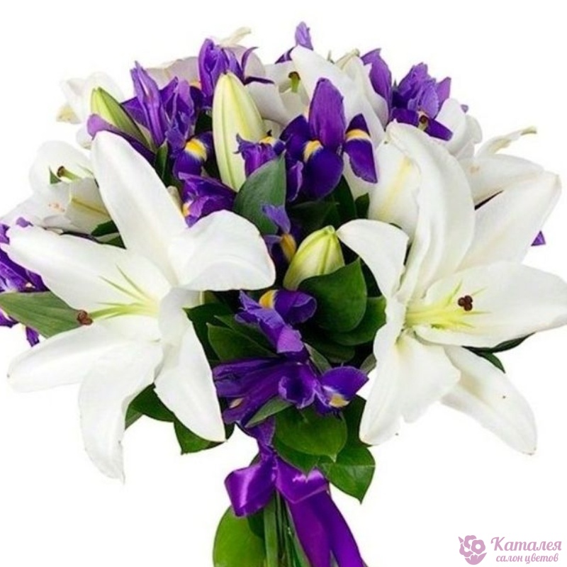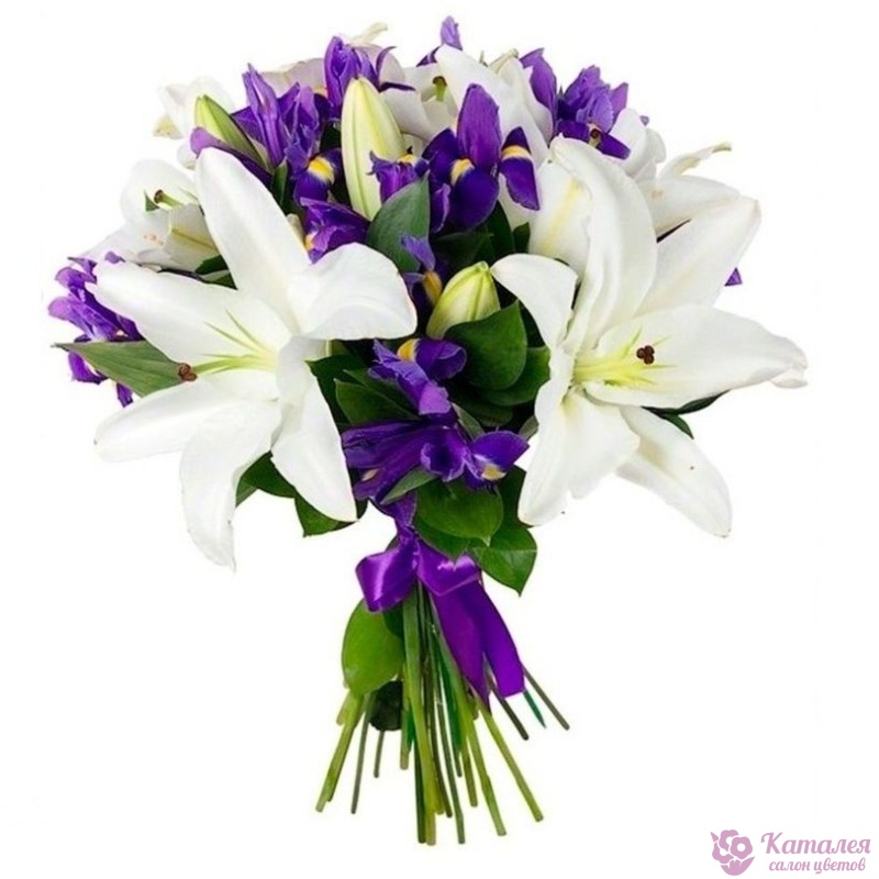 Букет состоит из 15 ирисов, 4 ветки белой лилии, рускус, прозрачная упаковка, атласная лента.